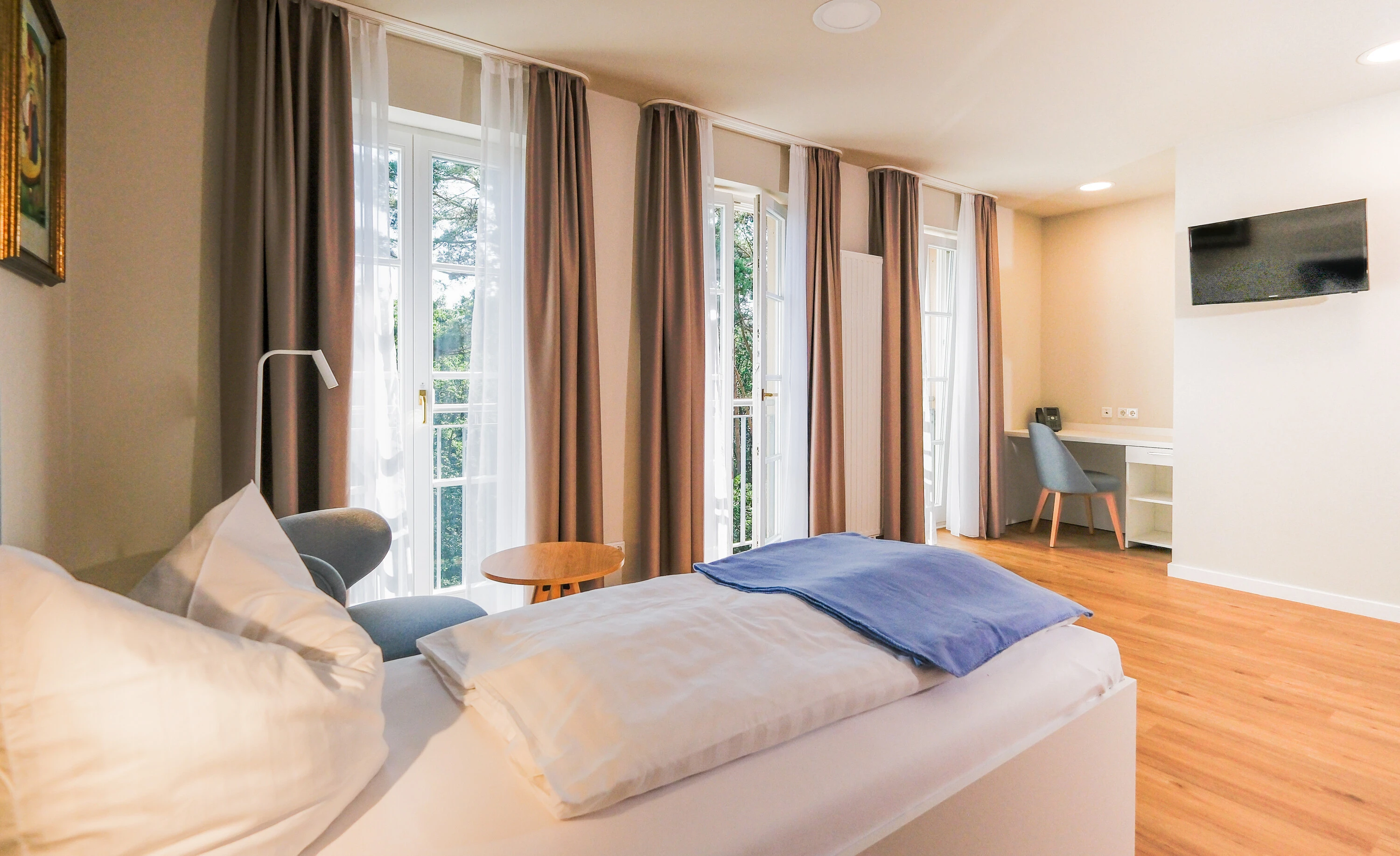 Unsere Klinik vereint Geborgenheit mit großzügigem Ambiente. Helle Zimmer mit Blick in den Wildpark, Aufenthaltsräume, Fitnessstudio, und ein moderner Sauna-Bereich mit Pool bieten Raum für Rückzug, Austausch, Bewegung und Entspannung.